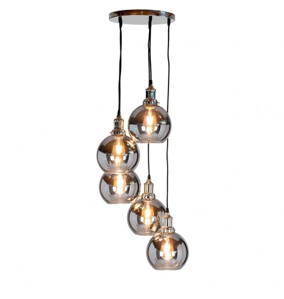 Hanginglight Camdonis a beautiful lamp with five lamps made of glass. The lamps hang in different heights on the round ceiling plate and together form a whole!