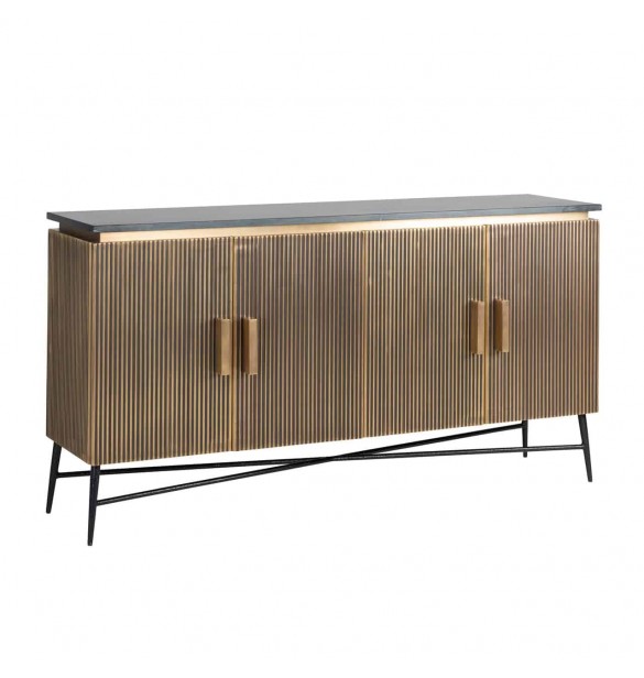 Sideboard Ironville 4-doors is a unique sideboard in gold/brass with ribbed relief and black marble top. Mid-Century Modern style (sixties) in a new look!